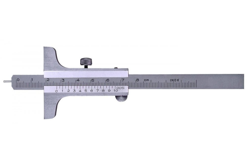 Ze stali nierdzewnej. Podziałka chromowana na mat. Z wymiennym, hartowanym trzpieniem stalowym. Podziałka w mm, wyposażona w noniusz o rozdzielczości 1/20 mm. Z zaciskiem ustalającym. Tolerancja wg DIN 862.