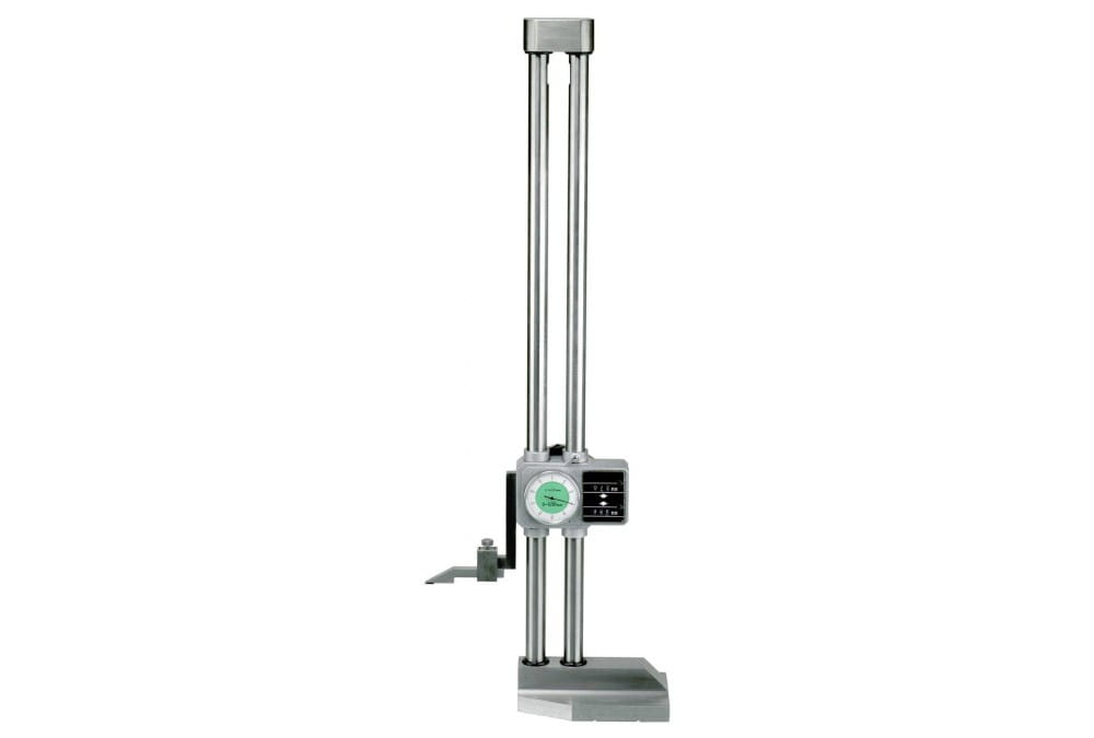 Wynik pomiaru odczytuje się w całych mm na liczniku, a w setnych częściach mm na wskaźniku zegarowym. 1 obrót wskazówki = 1 mm. Z dwoma liczydłami, dodającym i odejmującym, które mogą być indywidualnie zerowane przy dowolnej wartości. Wygodne nastawianie wysokości za pomocą pokrętła na tylnej ściance. Końcówka pomiarowa z węglików spiekanych. DIN 862.