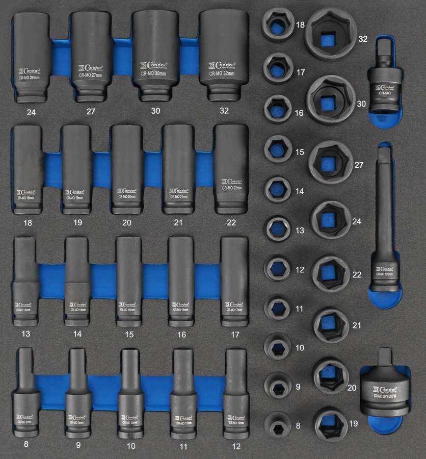 - Nasadki 6-kątne, 1/2": 8, 9, 10, 11, 12, 13, 14, 15, 16, 17, 18, 19, 20, 21, 22, 24, 27, 30, 32 mm,