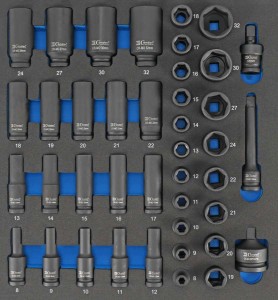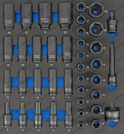 - Nasadki 6-kątne, długie, 1/2": 8, 9, 10, 11, 12, 13, 14, 15, 16, 17, 18, 19, 20, 21, 22, 24, 27, 30, 32 mm,